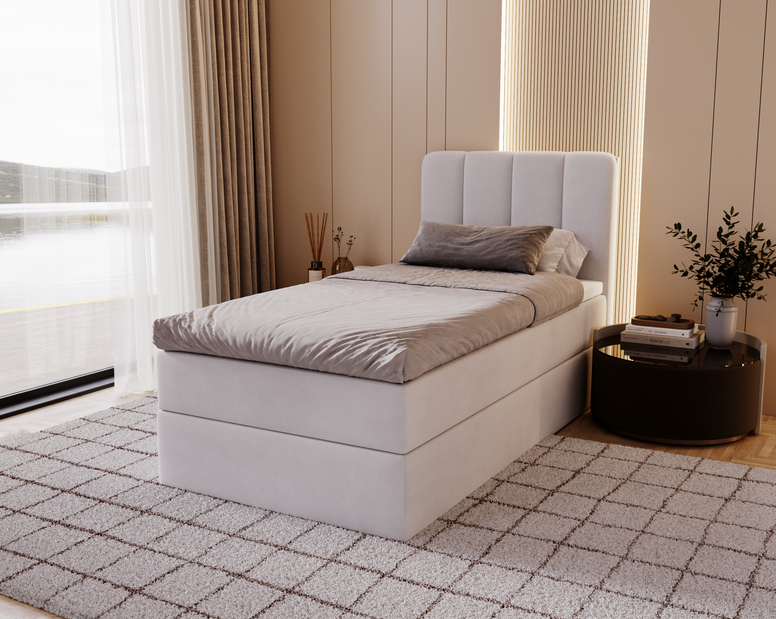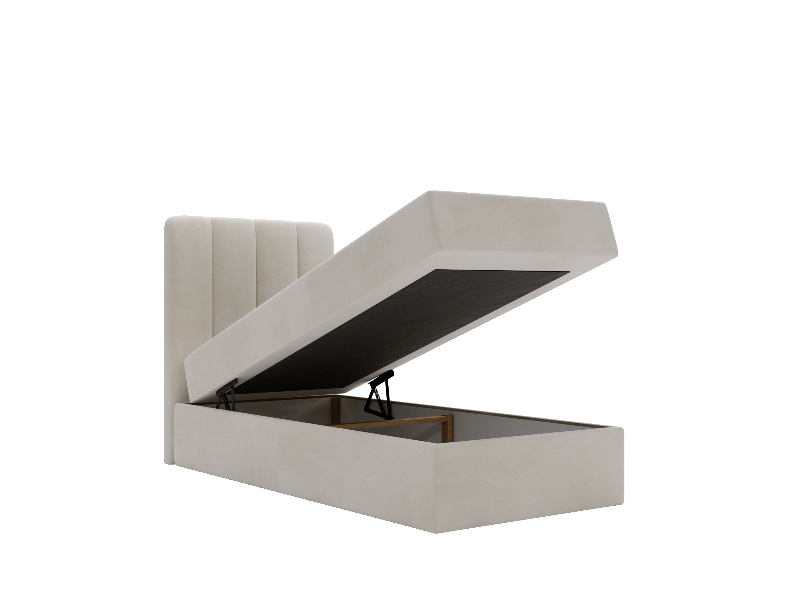 materac w komplecie, z zagłówkiem, ze stelażem, pojemnik na pościel otwierany do góry